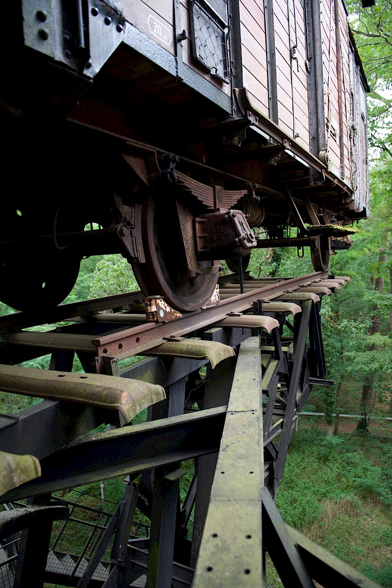 La seconde opération significative se situe au niveau de l’Hommage aux déportés d’Eva Aeppli. Évocation des désastres de la Shoah, l’œuvre se compose d’un wagon de la SNCF des années 1930 suspendu sur une plateforme à plus de 13 mètres de haut, à l’intérieur duquel se trouvent 15 figures en soie blanche et velours marron. Très dégradé, le wagon de l’Hommage aux déportés est restauré à l’identique après le traitement des lames de bois endommagées. Son isolation thermique et le remplacement de la climatisation à l’intérieur du wagon permettent de maintenir les sculptures dans un climat stable pour leur bonne conservation.